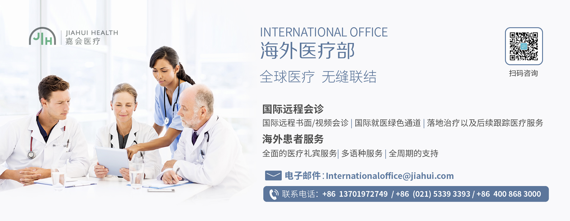 作为中国创新型、一体化的医疗健康生态系统,嘉会医疗致力于建立以三级综合国际医院为核心、包括“二级诊疗+社区初级诊疗+互联网医疗”在内的立体医疗网络,提供全面遵循国际标准和可信赖的医疗服务,从健康管理、门诊服务,到复杂手术及住院治疗,更可无缝对接海外转诊,带来“以家庭为中心”的长期持续关怀,满足人生各阶段健康医疗需求。